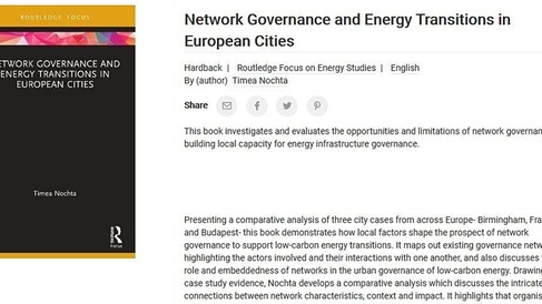 Join us for the launch of the recently published book "Network Governance and Energy Transitions in European Cities", authored by Dr Timea Nochta. The launch will feature a short introduction to the book by the author, as well as comments from colleagues Dr Louise Reardon (University of Birmingham) and Dr Dai Morgan (University of Cambridge).