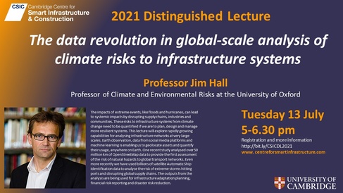 Abstract: The impacts of extreme events, like floods and hurricanes, can lead to systemic impacts by disrupting supply chains, industries and communities. These risks to infrastructure systems from climate change need to be quantified if we are to plan, design and manage more resilient systems. This lecture will explore rapidly growing capabilities for analysing infrastructure networks at very large scales. Earth observation, data from social media platforms and machine learning is enabling us to geolocate assets and quantify their usage, anywhere on Earth. One recent study analysed over 50 million km of OpenStreetMap data to provide the first assessment of the risk of natural hazards to global transport networks. Even more recently we have used billions of satellite Automatic Ship Identification data to analyse the risk of extreme storms hitting ports and disrupting global supply chains. The outputs from the analysis are being used for infrastructure adaptation planning, financial risk reporting and disaster risk reduction.