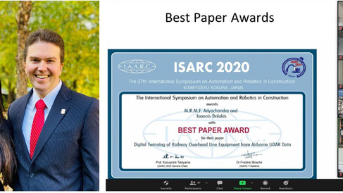 A conference paper titled “Digital Twinning of Railway Overhead Line Equipment from Airborne LiDAR Data” authored by PhD student Mahendrini Ariyachandra and CSIC co-investigator Dr Ioannis Brilakis, received the Best Paper Award presented at the 37th International Symposium on Automation and Robotics in Construction (ISARC).