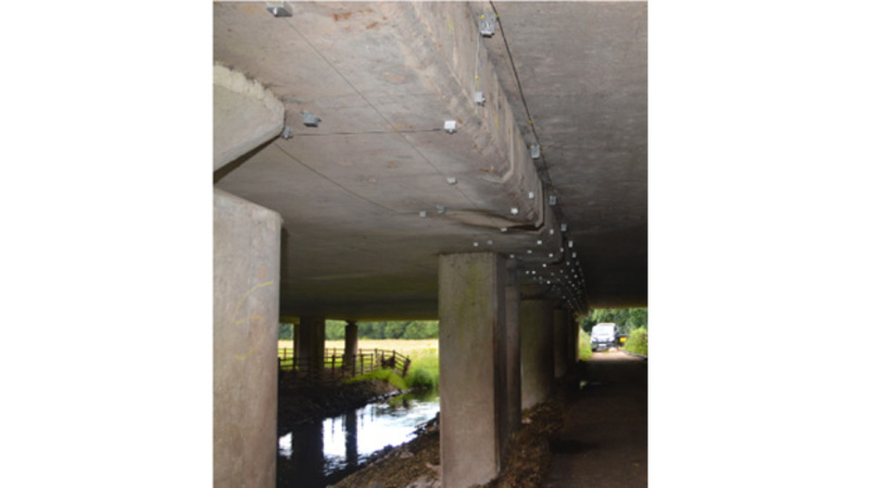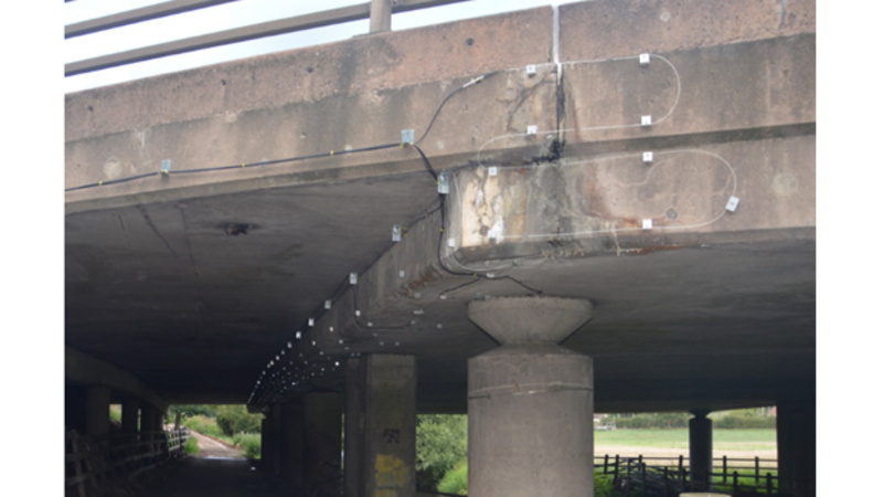 A team of CSIC researchers have installed a fibre optic strain sensors network across the length of a half-joint concrete bridge carrying the M6 motorway over the River Penk in Staffordshire, UK. The bridge has deteriorating half-joint connections, where concrete spalling and reinforcement corrosion is evident.
