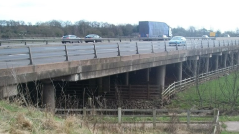 The M6 motorway bridge crossing over the River Penk in Staffordshire, UK