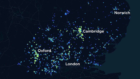 Titled 'High Growth Communities' (p.51 in the report), the case study is authored by Andrea Imaz, Senior Urban Designer at Perkins & Will and CSIC Researcher Mingda Yuan. Part of a secondment with both CSIC and The Alan Turing Institute, the study analyses hotspots of sci-tech and life sciences companies across the Oxford-Cambridge arc, the Cambridge Norwich Tech Corridor and London's northern periphery.