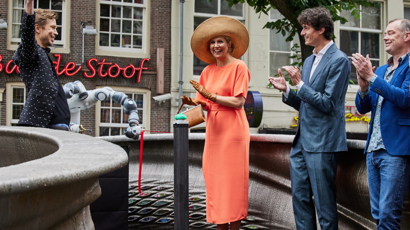 Queen Máxima of the Netherlands cuts the ribbon with the aid of a robotic arm