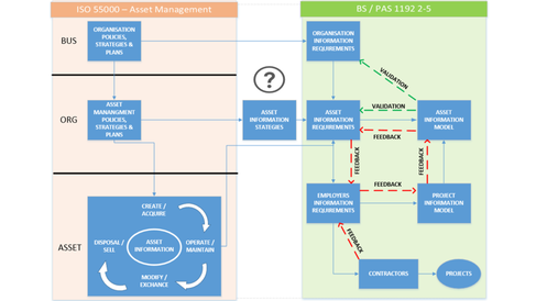 The aim is to create a model-based framework approach to aid in the development of whole-life asset information requirements (AIR) linking the BIM 1192 standards with the ISO 55000 standards (Figure 1). A tool will be built that can automatically link AIR to Uniclass 2015 – a unified classification system for the construction industry. Uniclass 15 contains consistent tables classifying items of all scale from a facility such as a railway through to products such as a CCTV camera in a railway station. The asset information model will be validated for the organisation information requirements and objectives.