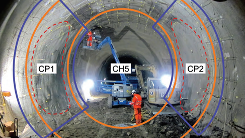 CSIC embedded a DFOS system within the thickened SCL in enlargement chamber CH5 (Figure 1 – download the full case study to see the figure) at two cross-passage junctions, CP1 and CP2 (Figure 2 – pictured above), in order to monitor the changes in the continuous strain profile that occurred in the tunnel lining during the excavation. The distributed nature of the strain measurements obtained from the DFOS system made it possible to reconstruct the strain map in the tunnel lining during every stage of the cross-passage excavations, with unrivalled spatial detail. This information was used to compare the predicted structural behaviour obtained from the finite-element models with the true performance of the tunnel lining.