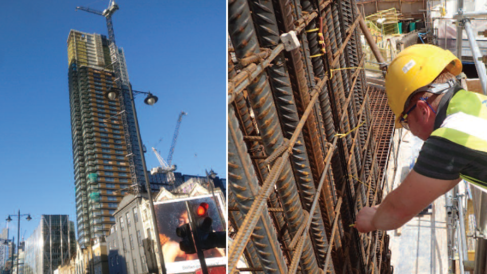 The tower was constructed using an automated jumpform that incorporated the whole building footprint, including the columns. CSIC’s fibre optic (FO) strain and temperature sensing cables were continuously embedded inside two columns and two locations in the core walls of Principal Tower, as construction progressed. The FO cables were prepared in advance with sufficient length to extend all the way up to the top of the building, and wound on cable reels that were housed in the jumpform rig. This enabled the rig operatives to un-reel the cables as the construction progressed upwards. The FO cables were tied to the reinforcement of the instrumented elements during steel fixing, and subsequently embedded in the concrete (Figure 2, pictured above). CSIC trained the contractor’s operatives to install the FO cables, and CSIC researchers analysed the data and provided the required information to the contractor and design engineers.