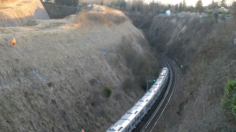 The Hooley Cutting, near south London, carries the main railway line from London to Brighton through the North Downs. The 30m-deep cutting slopes are susceptible to landslides and need measures to prevent rockfalls reaching the tracks, which have caused train derailments and line closures in the past.