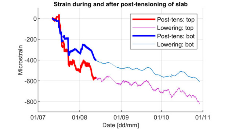 Figure 2: Compressive strain measured from two of the FBG sensors embedded in the strong floor: during (thicker lines) and after (thinner lines) post-tensioning of the slab