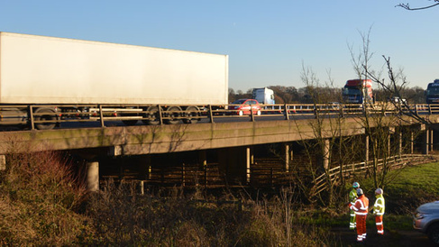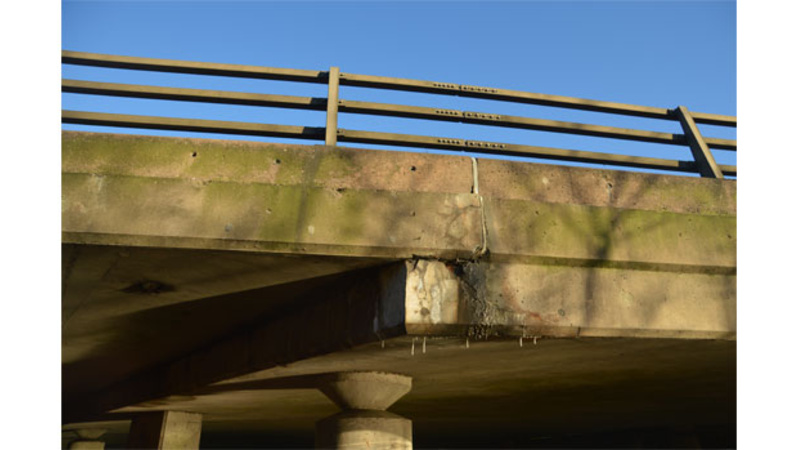 A damaged half-joint on a concrete bridge carrying the M6 motorway over the River Penk in Staffordshire, UK, will be instrumented with 24 AE sensors. A network of 80 fibre Bragg grating (FBG) sensors will be used to correlate the AE-monitored behaviour of concrete with deformation and validate the results from the damage severity and localisation AE algorithms developed during the experimental studies.